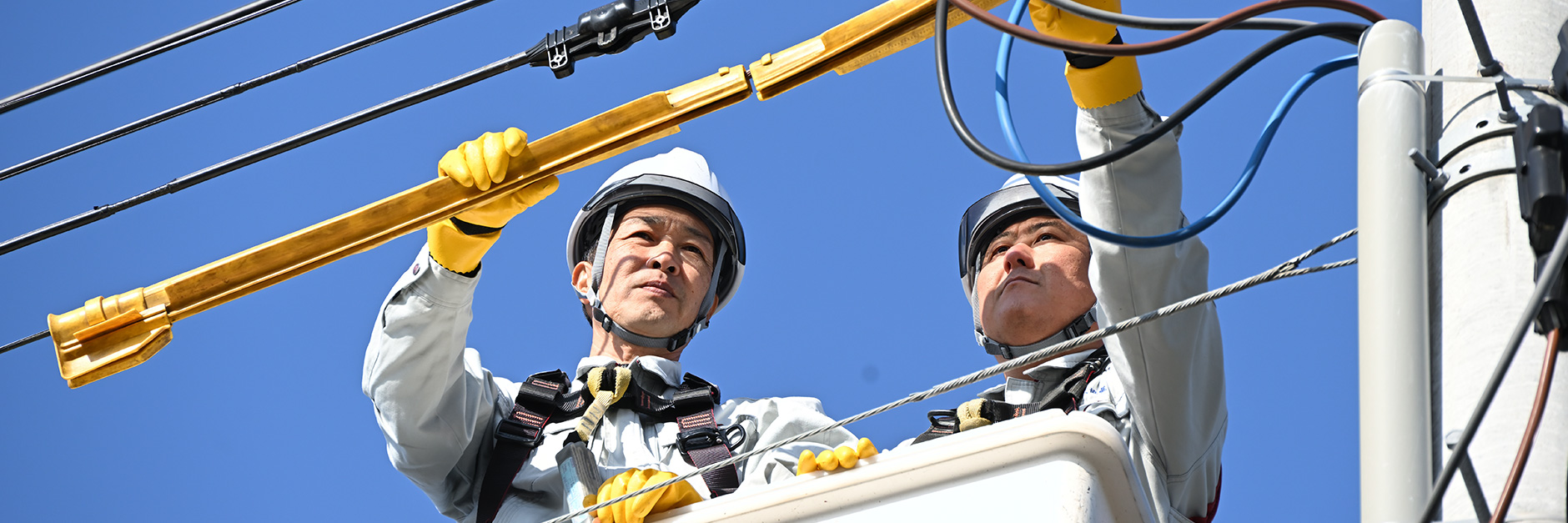 ご家庭や事業所が安心して電気を使えるよう、電柱から建物までの引込線工事、点検・張替え工事及び撤去、そしてそれに関わる付帯作業を日々安全第一で進めています。
